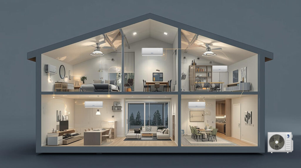 Systém umožňuje pripojiť až päť vnútorných jednotiek k jednej vonkajšej jednotke, čím zabezpečuje komfortnú mikroklímu vo viacerých miestnostiach súčasne. Toto riešenie je ideálne pre byty, kancelárie a hotely, kde je dôležitá úspora priestoru a čistý vzhľad budovy. Centralizovaná prevádzka zároveň umožňuje efektívnejšie rozdelenie chladiaceho a vykurovacieho výkonu medzi miestnosti, znižuje spotrebu energie a udržiava stabilnú teplotu v celej budove.